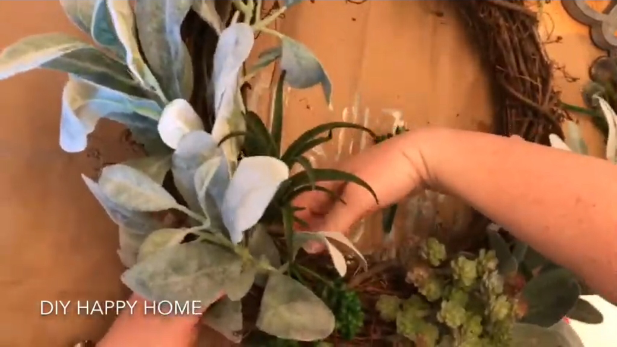 Next, I used an 18 inch wide round grapevine Wreath as the base of my Wreath. I then chose faux lamb’s ear from Walmart’s floral section. I also used various faux succulents that I bought from Walmart, The Dollar Tree, and The Flower and Home Marketplace. I arranged everything first, then secured it all with a hot glue gun.