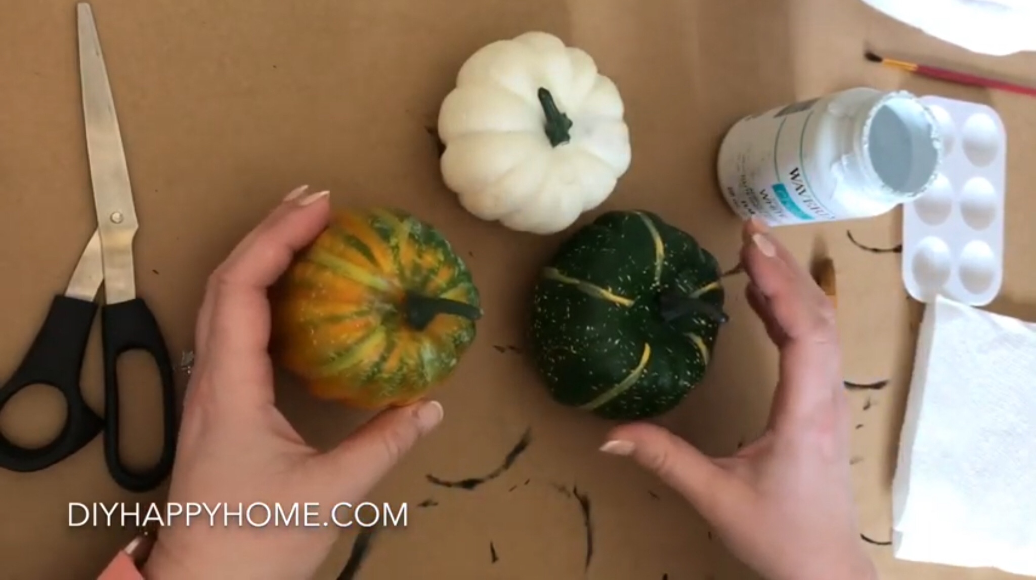 To make the sweater pumpkins, I purchased three pumpkins at The Dollar Tree.