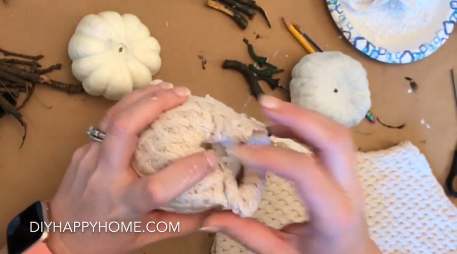 Begin to fold and tuck the fabric into the top of the pumpkin, tucking it into the larger hole you’ve created. Keep folding and tucking until all of the fabric is tucked into the hole at the top of the pumpkin. Next, do the same to the bottom of the pumpkin. Create a larger hole, then fold and tuck in the fabric until all of the fabric is tucked into the bottom of the pumpkin.