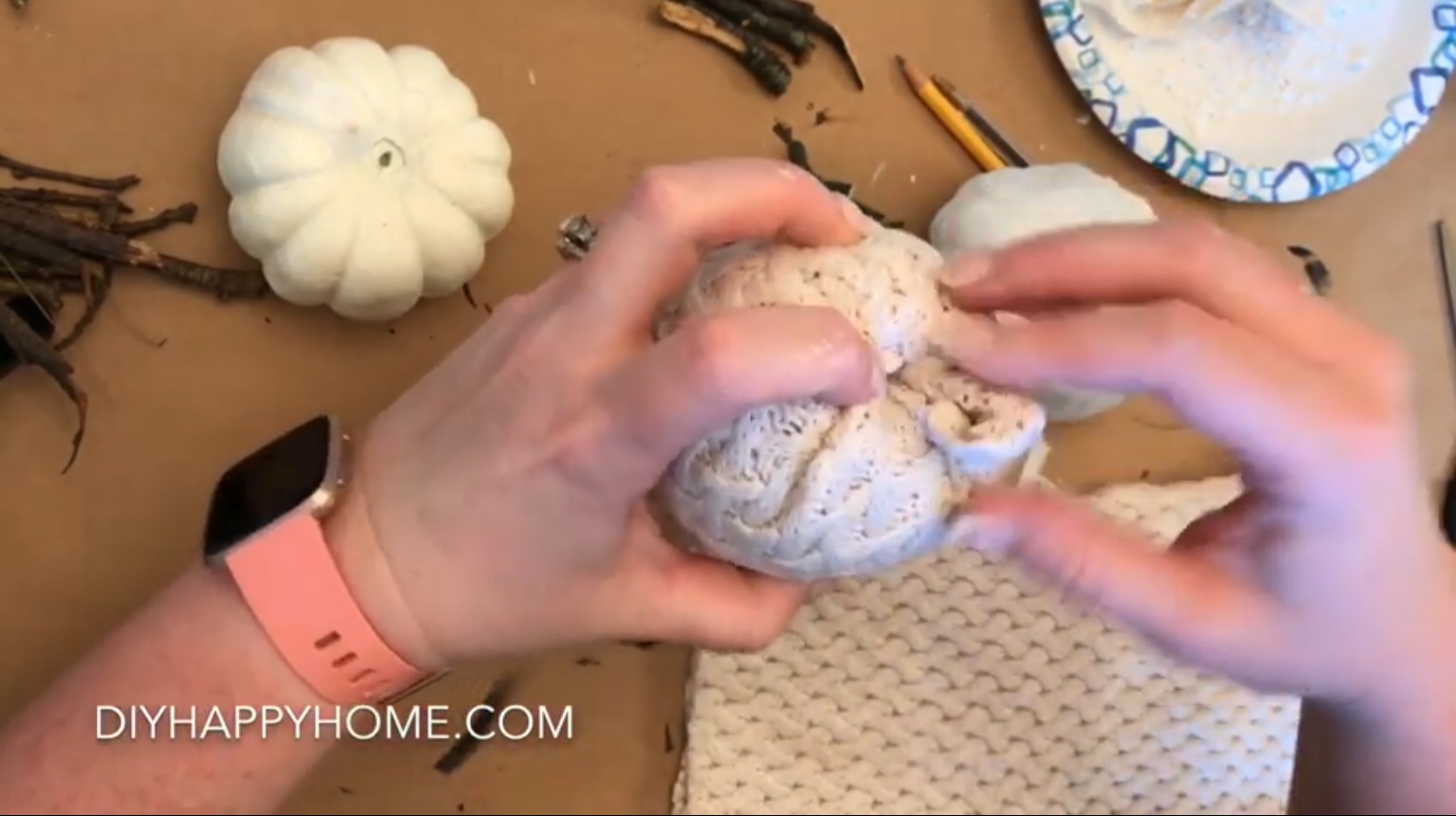 I decided the darker two pumpkins might show through the knit of the sweater. I decided to paint the pumpkins with Waverly white chalk paint. The Waverly white chalk paint dries pretty quickly and only one coat is necessary.