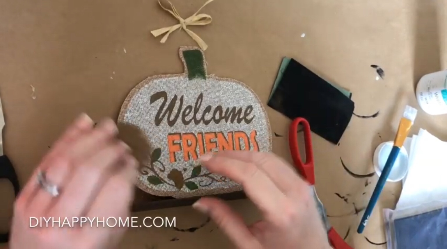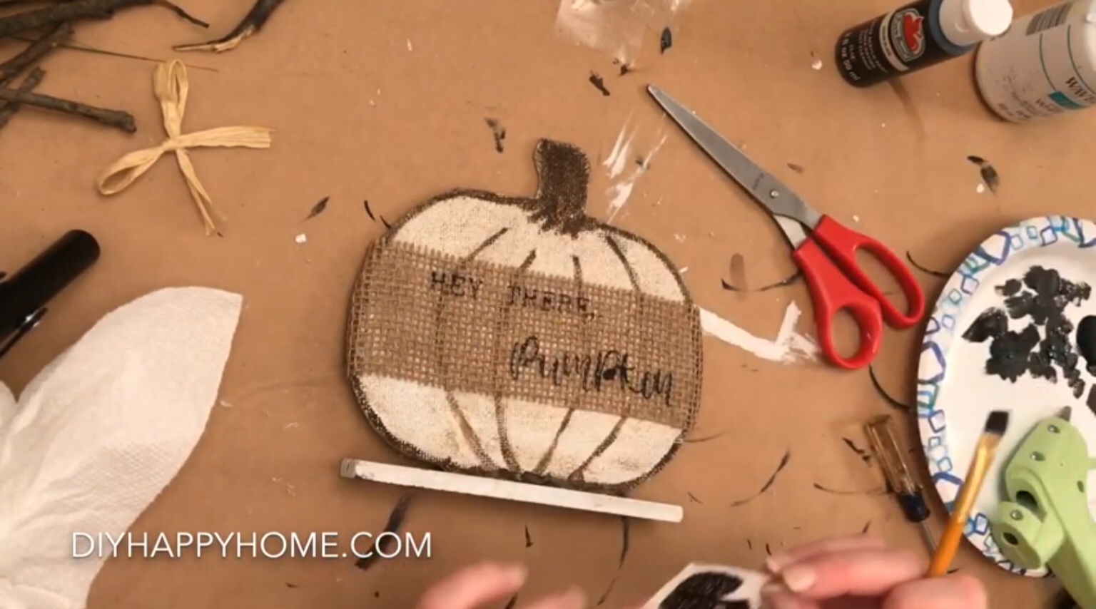 You could still see the Friends part that the previous pumpkin had, so I decided to use burlap ribbon that I purchased at The Dollar Tree to cover it.