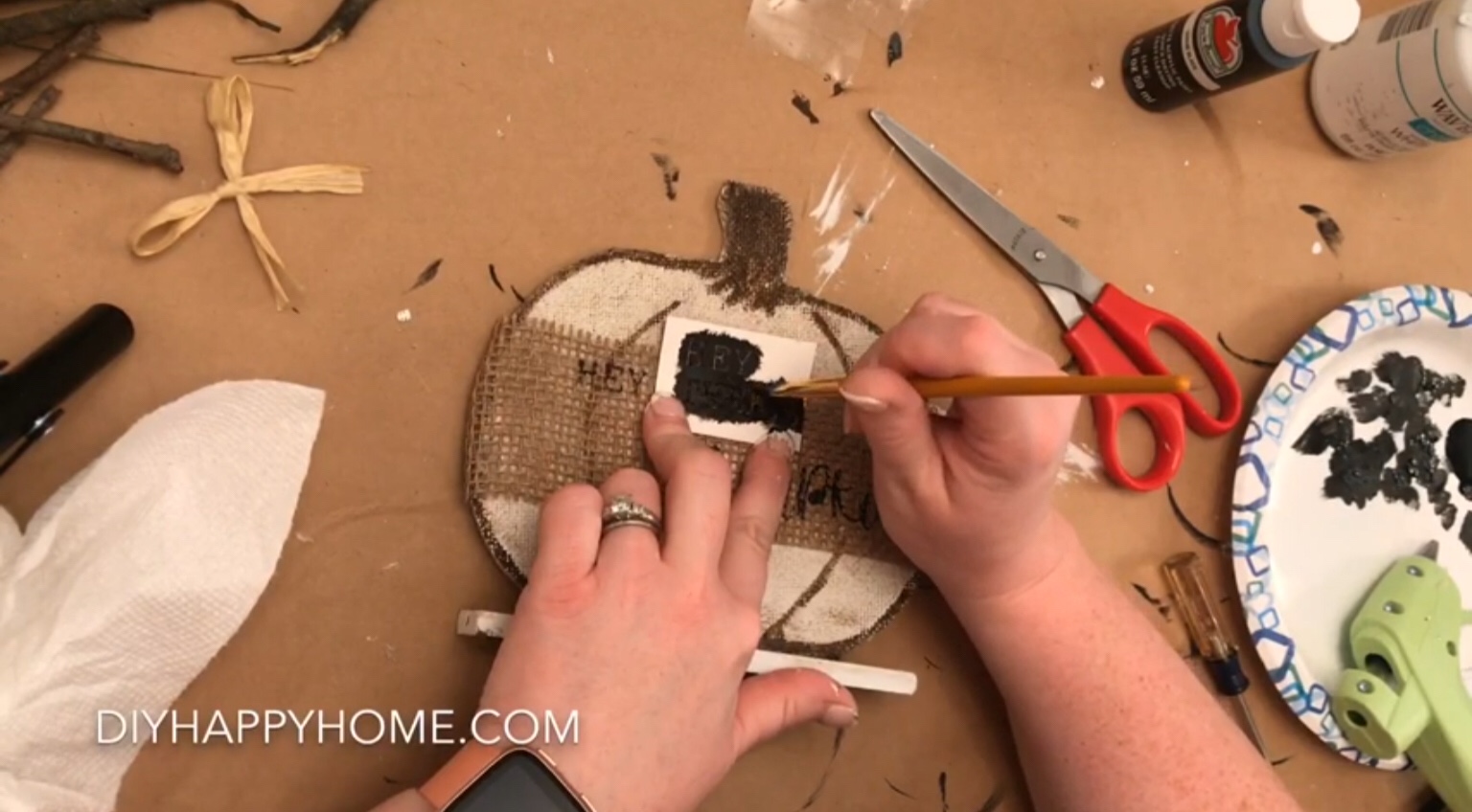 Then I used a black sharpie to fill in any spots that didn’t have the writing. It helped to fill in any bald spots underneath the burlap.