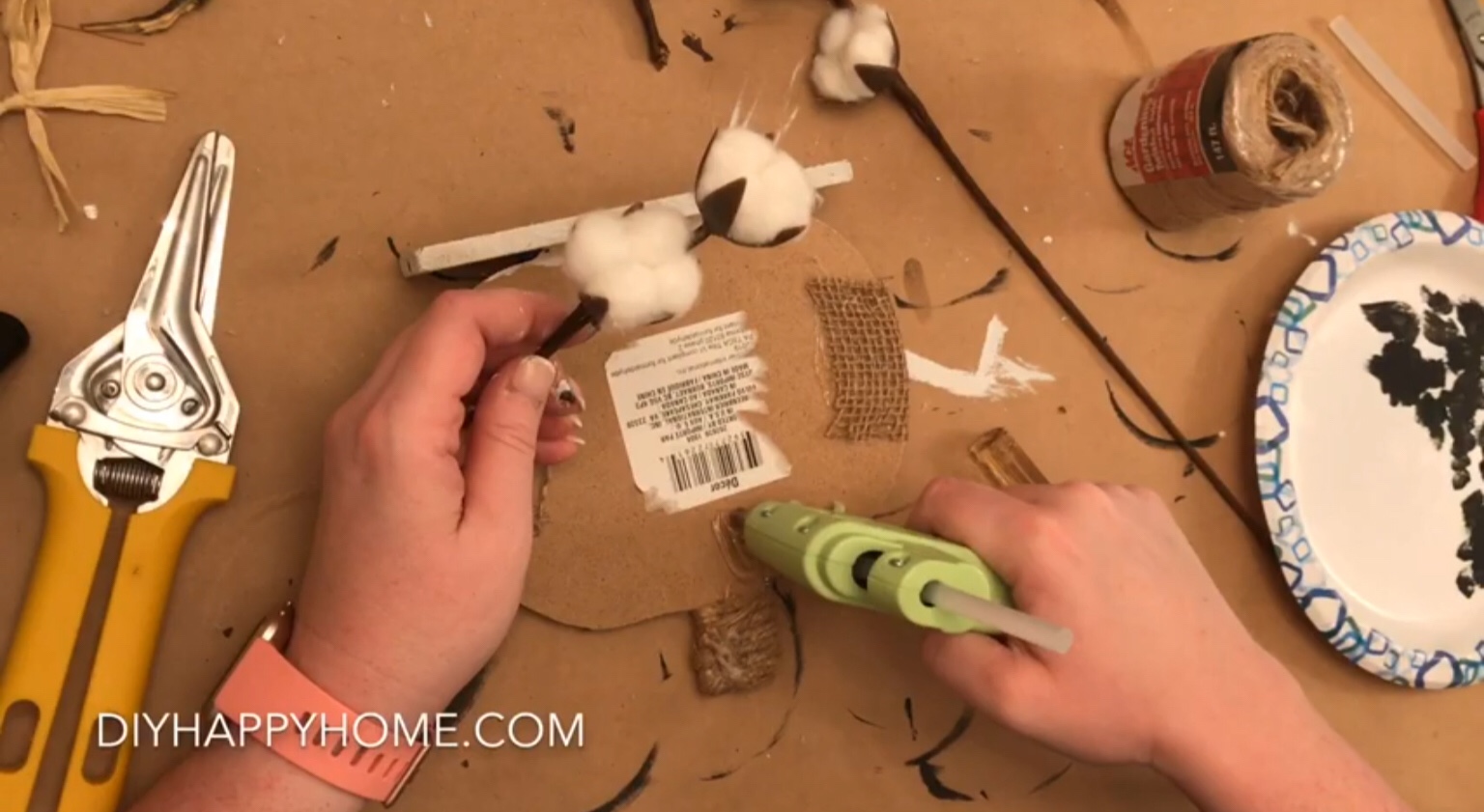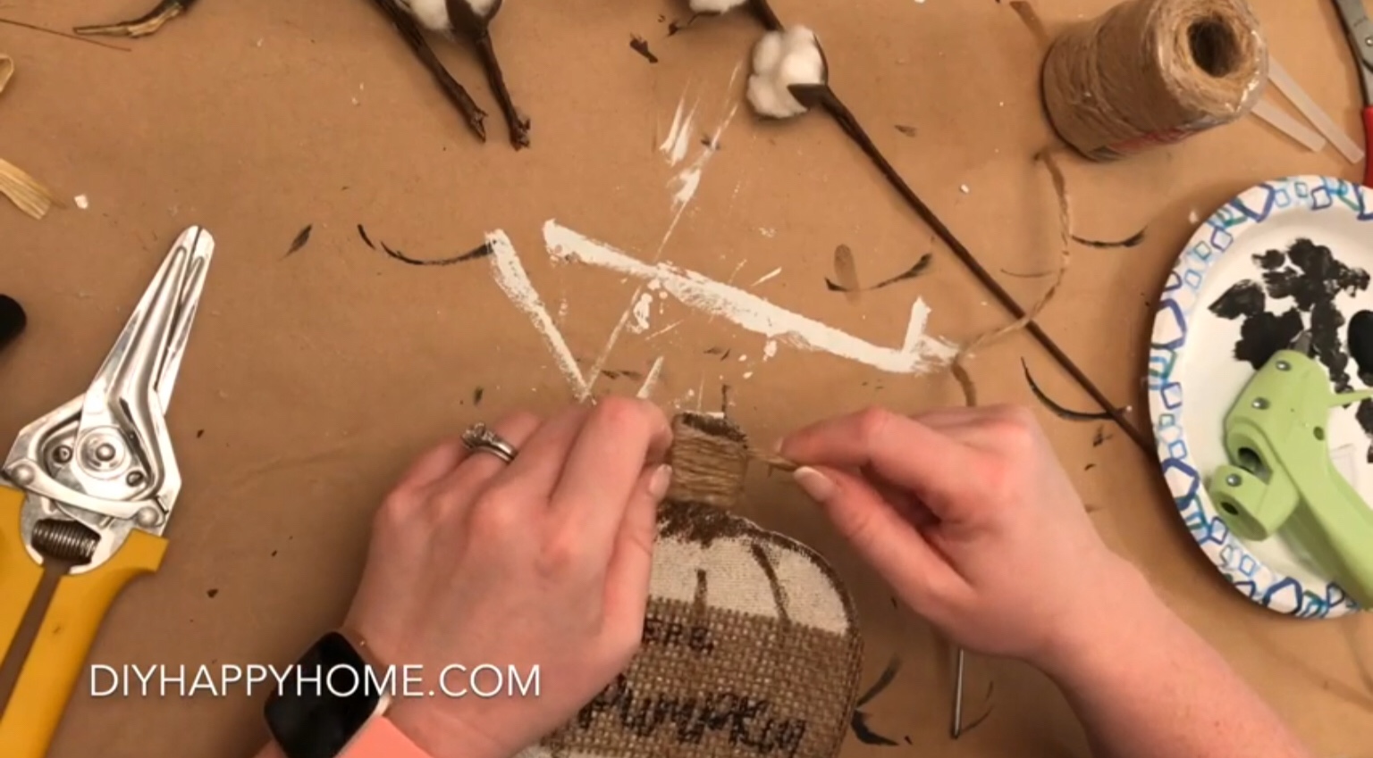 Next, I wound some garden twine around the pumpkin stem, and secured it with some hot glue.