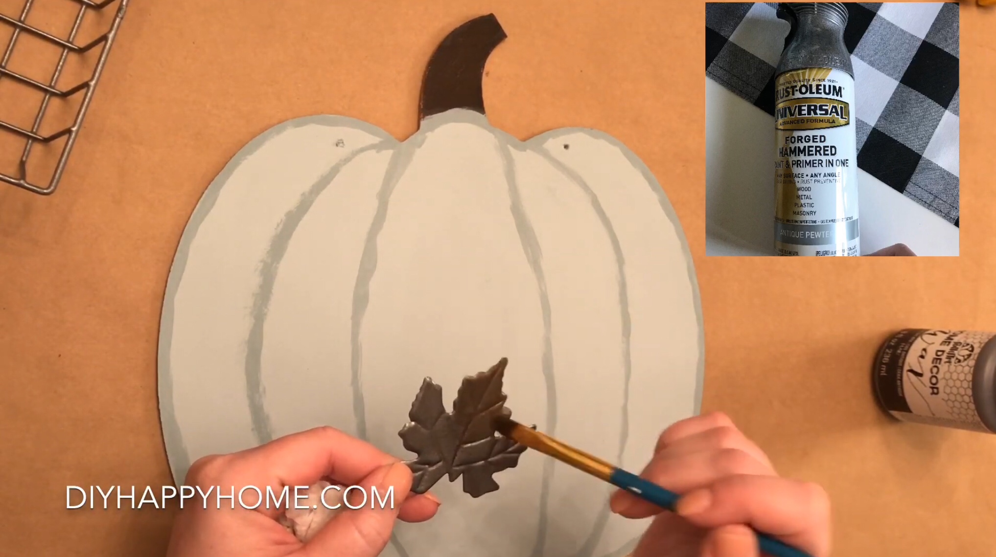 Next, I began to mimic the grooves a real pumpkin has by painting lines onto the pumpkin. I used a shade darker paint here, again using the same paint colors to mix it. Then, I spray painted both a metal leaf, and a white plastic coated wire basket (also purchased from The Dollar Tree) in antique pewter. See the can of spray paint in the image below.