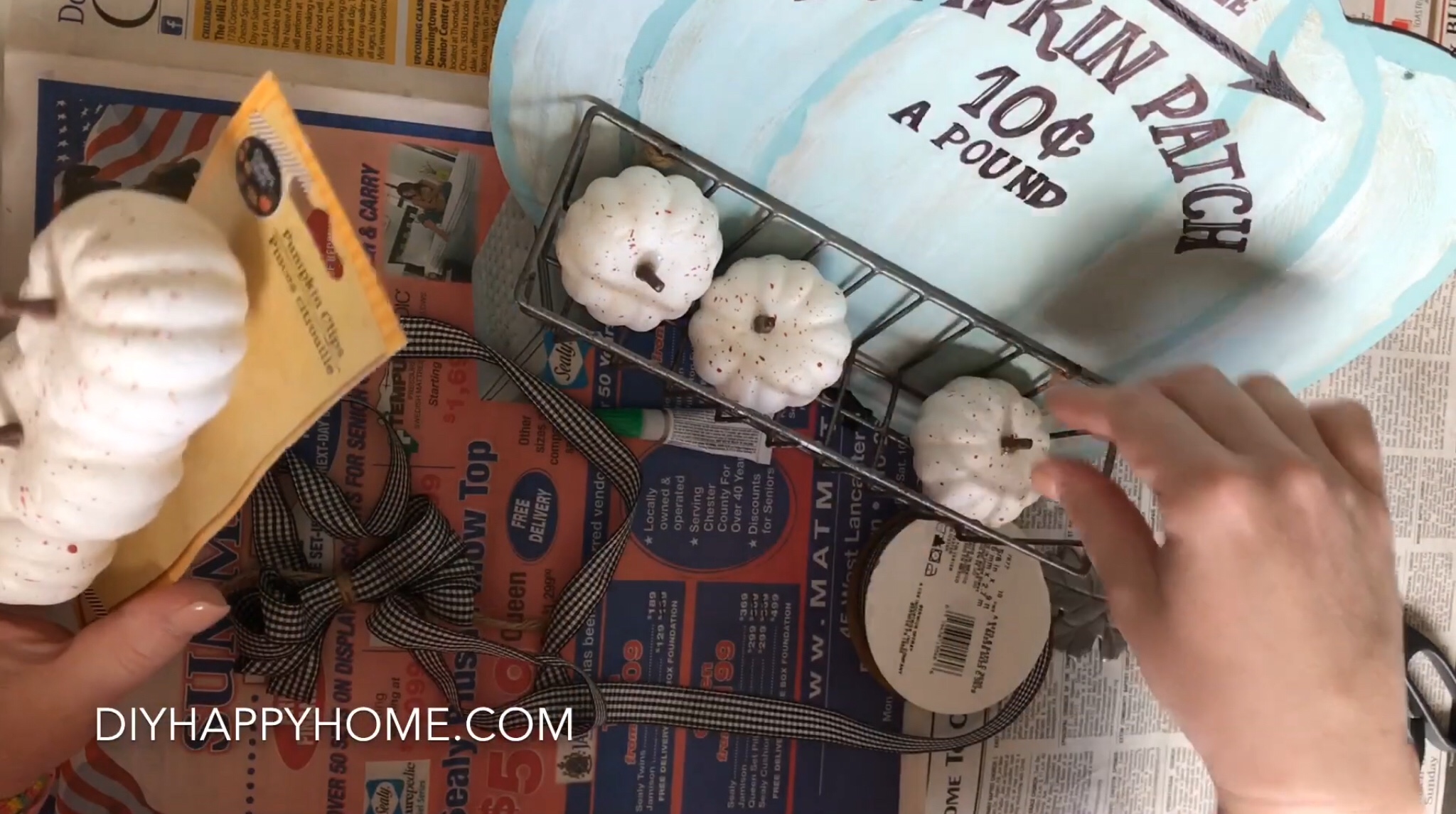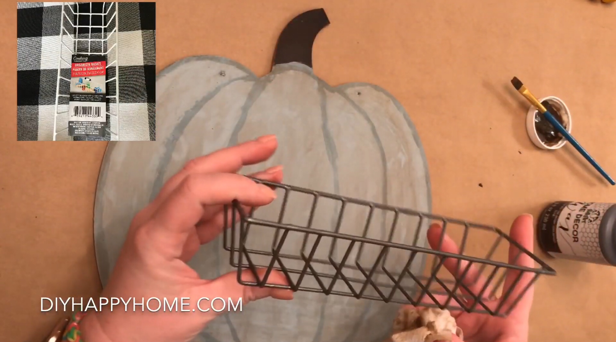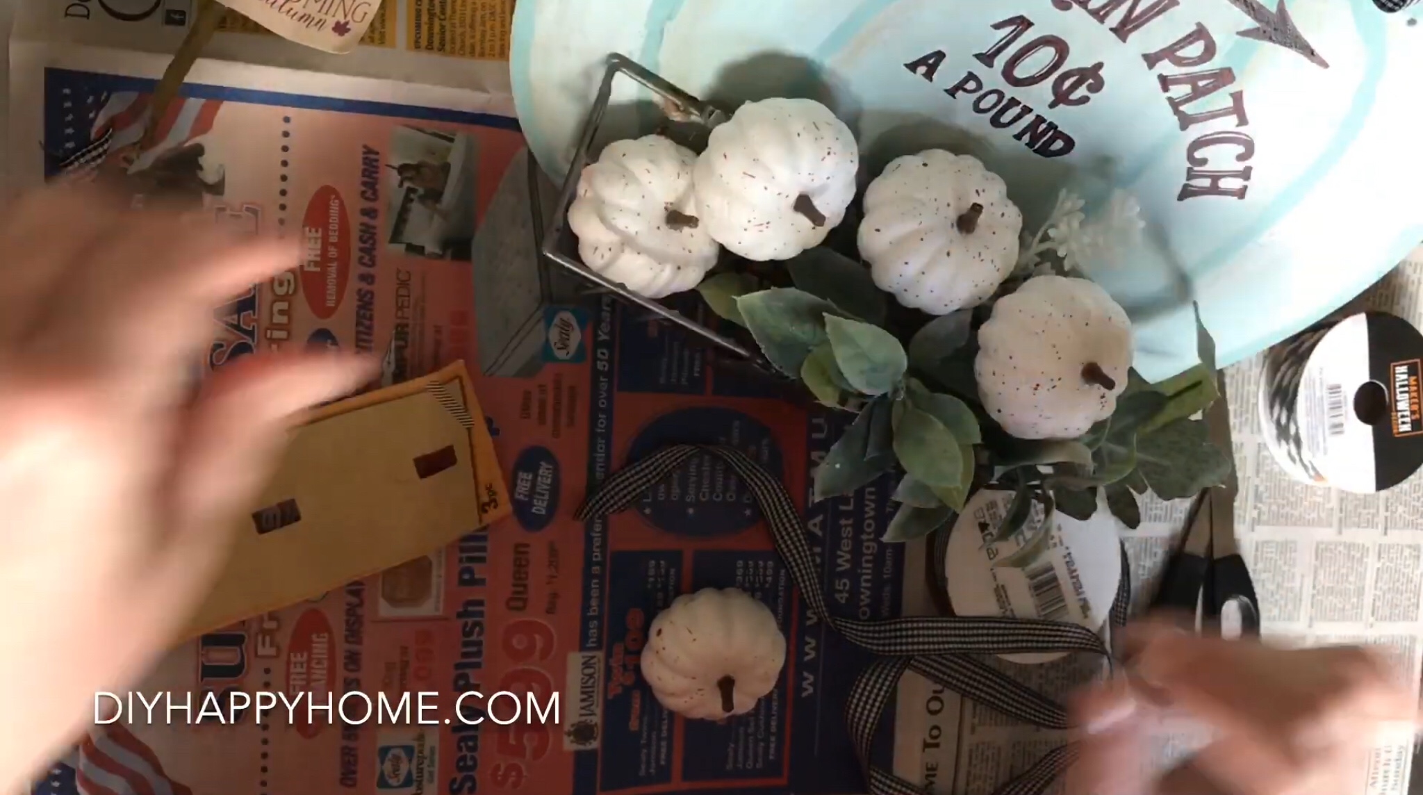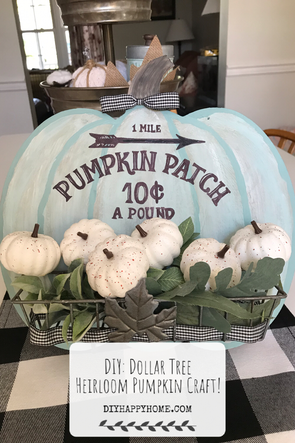 I purchased this pumpkin sign from The Dollar Tree with plans to transform it into something different. I wanted it to work with some of my heirloom pumpkin and farmhouse style decor. So I sought out to recreate it using some pretty colored paints, small pumpkins, a white plastic wrapped wire basket, and some faux greenery. Most of the items were purchased at The Dollar Tree.