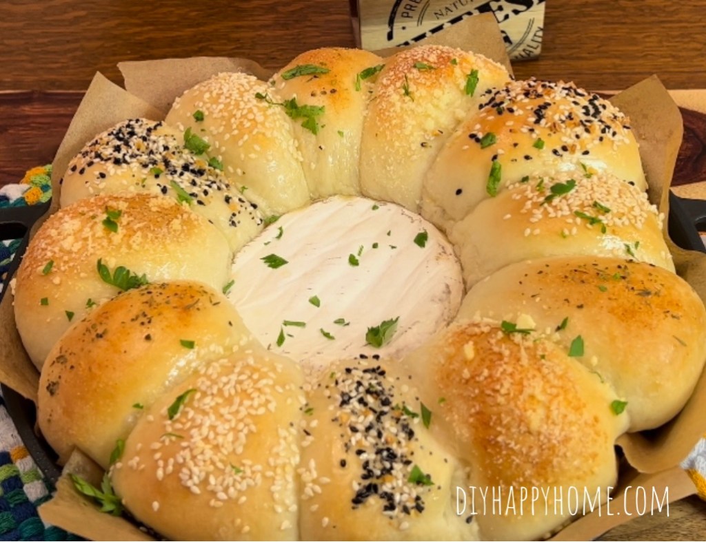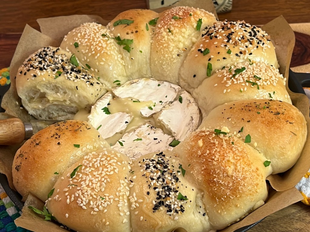 This scrumptious appetizer will please cheese lovers of all ages. Featuring buttery, velvety Double Crème Brie cheese surrounded by pillowy tear-apart rolls that are topped with butter, sesame, everything bagel seasonings, Romano cheese, and garlic and herbs. Dip the warm rolls into the gooey, silky, smooth melted cheese center for a delicious and memorable start to any celebration.