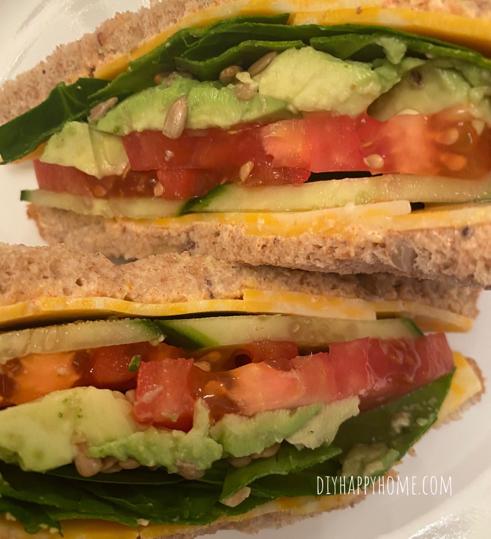 Next, top each slice of bread with a layer of Colby Jack cheese. Then, top one half with 4 slices of cucumber. Next, top with two large tomato slices. Then top with the half of the sliced avocado. Sprinkle on the sunflower seeds. Then add a layer of the fresh baby spinach leaves.