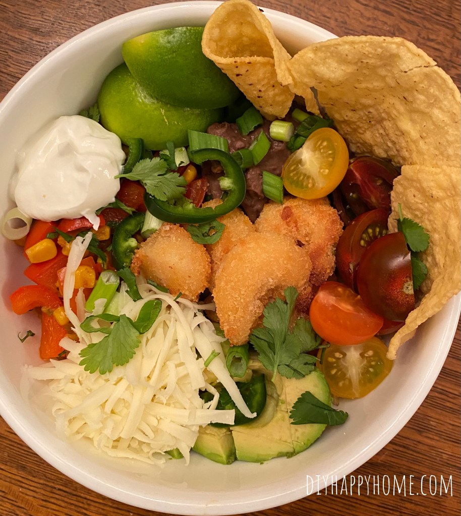 - Add the rice to the bottom of the bowl. Add the sautéed veggies. Put on some of the refried black beans, avocado, jalapeño, lime wedges, popcorn shrimp, grape tomatoes, cheese, and sour cream. Garnish with chopped scallions, cilantro, and tortilla chips, if desired. Serve with your favorite salsa or pico de gallo.