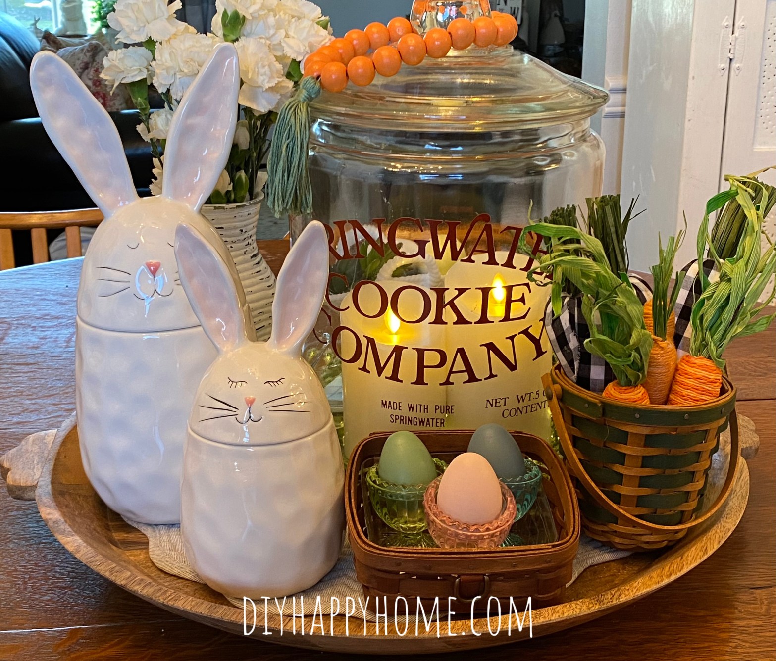 I placed two bunny π canisters that I purchased from Qvc from 10 Strawberry Street. I filled them with different chocolate filled Easter eggs (donβt tell my kids they are in there, or they will eat them all, ha ha!).