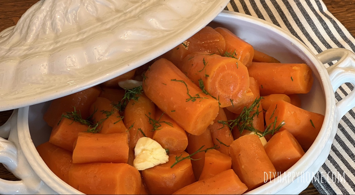 - Using a slotted spoon, remove carrots from the pot and put them in a serving dish. Add additional butter to the top of the carrots, and garnish with fresh dill, if desired.