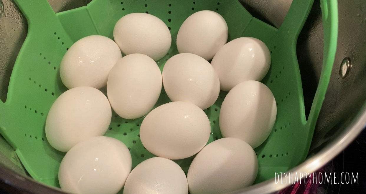 For easy peel hard boiled eggs try steaming them in a steam basket. The water comes to a boil so fast, allowing you to steam the eggs in 12 minutes! Cool down in an ice bath and the hard boiled eggs will be ready to eat. Perfect for deviled eggs, egg salad, or Cobb, Nicoise, or chef salad.