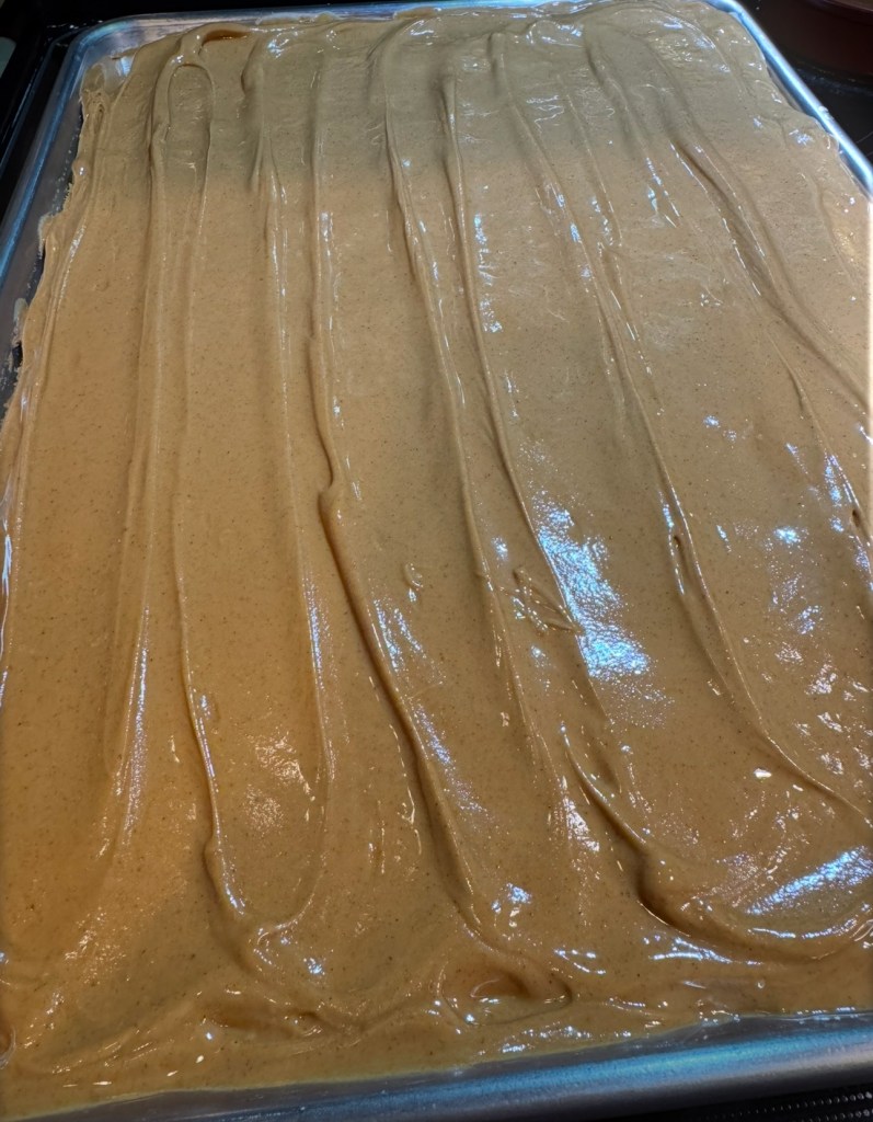- Pour into the prepared jelly roll pan. Bake at 350° for 15 – 20 minutes, until golden brown and a toothpick in the center comes out clean.