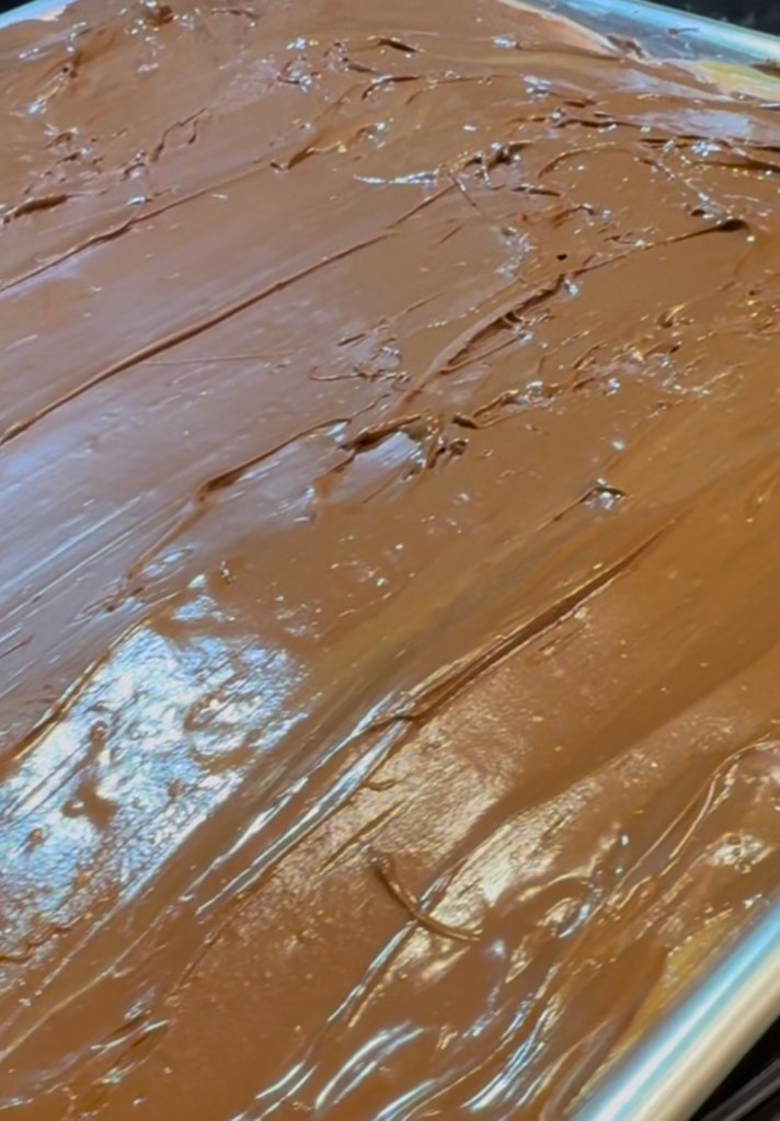 - Spread the melted Hershey’s chocolate over the peanut butter.