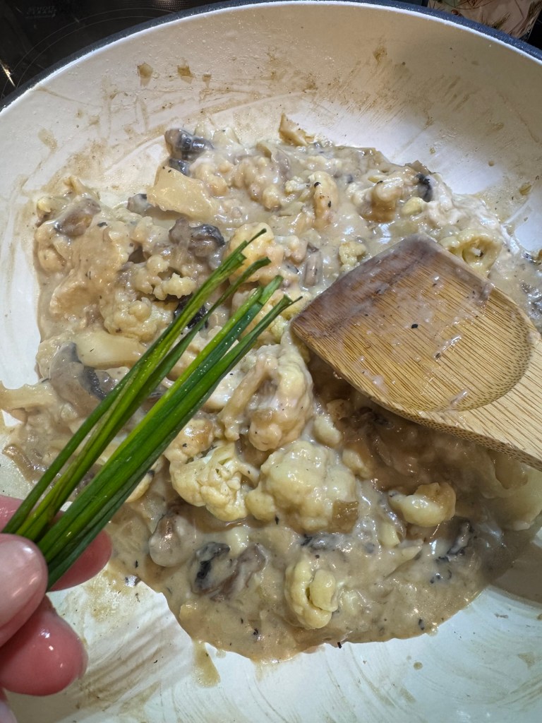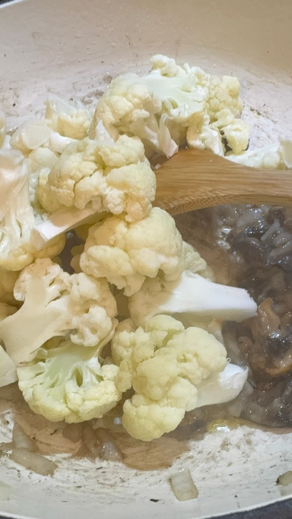 - Add in the par cooked cauliflower and sauté a minute or two. Add in some Salt and Pepper.