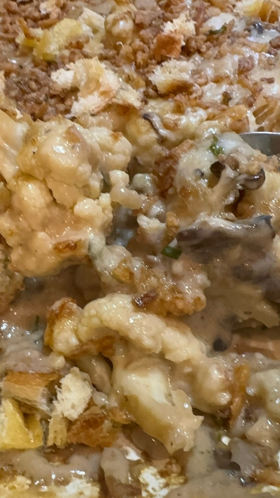 This cauliflower casserole is filled with delicious umami flavor, thanks to fresh mushrooms, sweet onions, and garlic.
