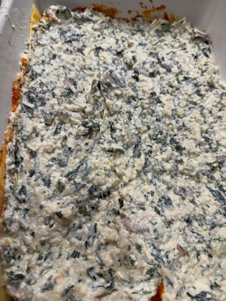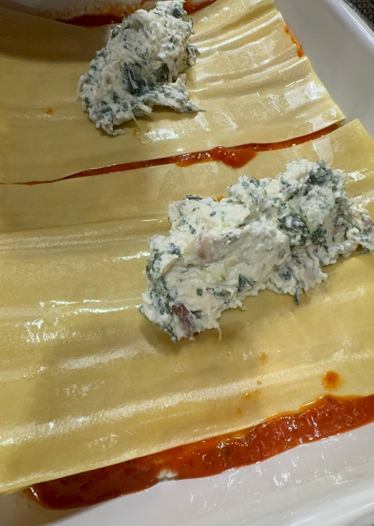 - Gently spread 1/2 of the filling mixture across the pasta sheets.