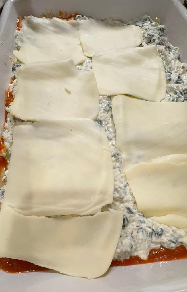 - In a 9” X 13” pan, add a thin layer of Tomato Basil sauce to the bottom of the pan.