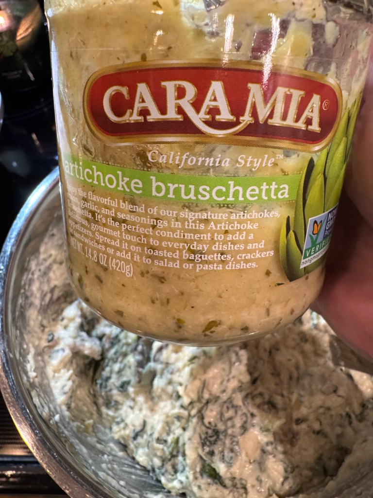 - 1/2 of a 14.8 ounce jar of Cara Mia California Style Artichoke Bruschetta