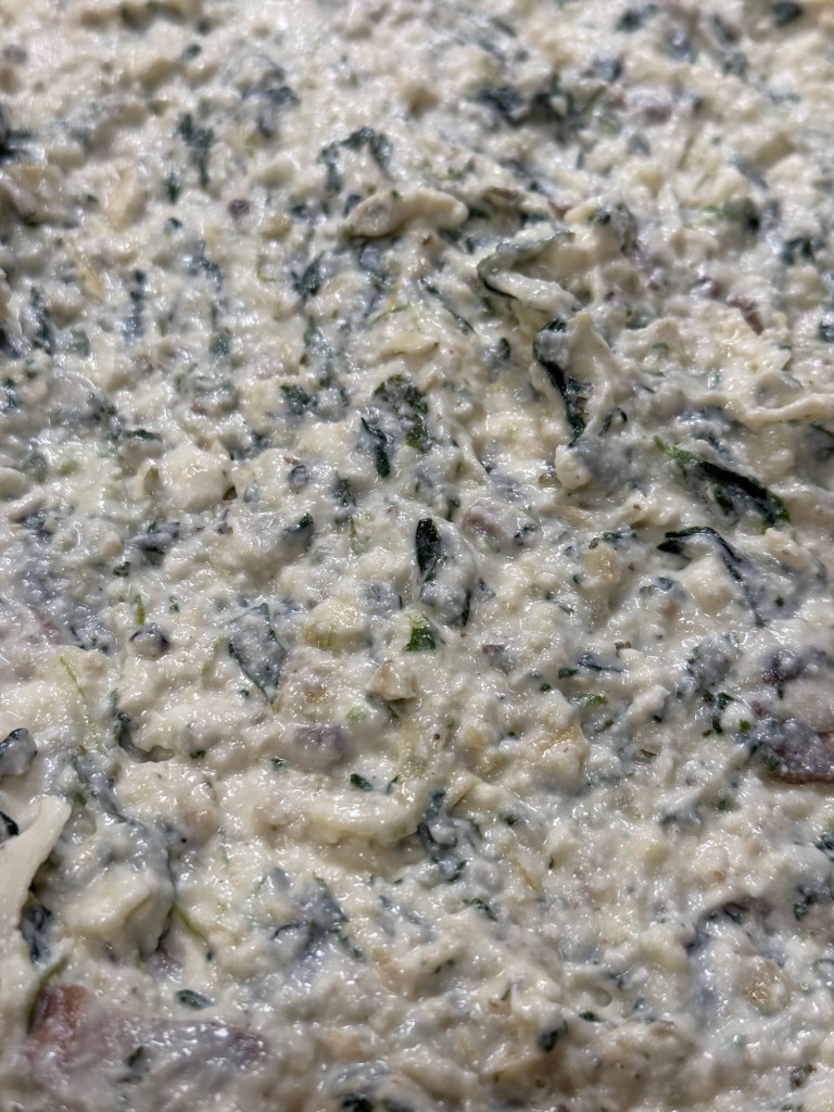 - In a large bowl, mix together Stracciatella cheese, Ricotta cheese, chopped spinach, mushrooms, artichoke bruschetta, garlic paste, basil paste, Italian seasoning, shredded mozzarella (reserve 1/2 cup for topping), Parmesan cheese, olive oil, salt, and pepper.