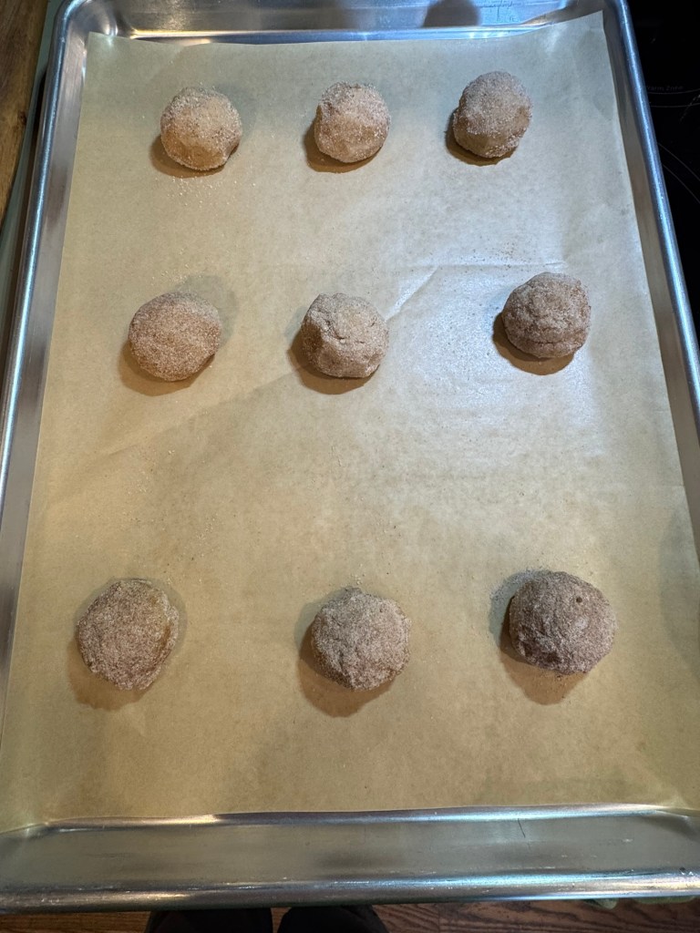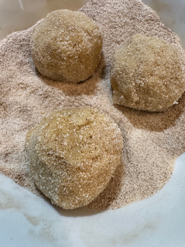 - Roll cookie dough into 1.5 inch sized balls (walnut sized). Coat each one in the cinnamon sugar topping and place on parchment paper, approximately 3 inches apart.