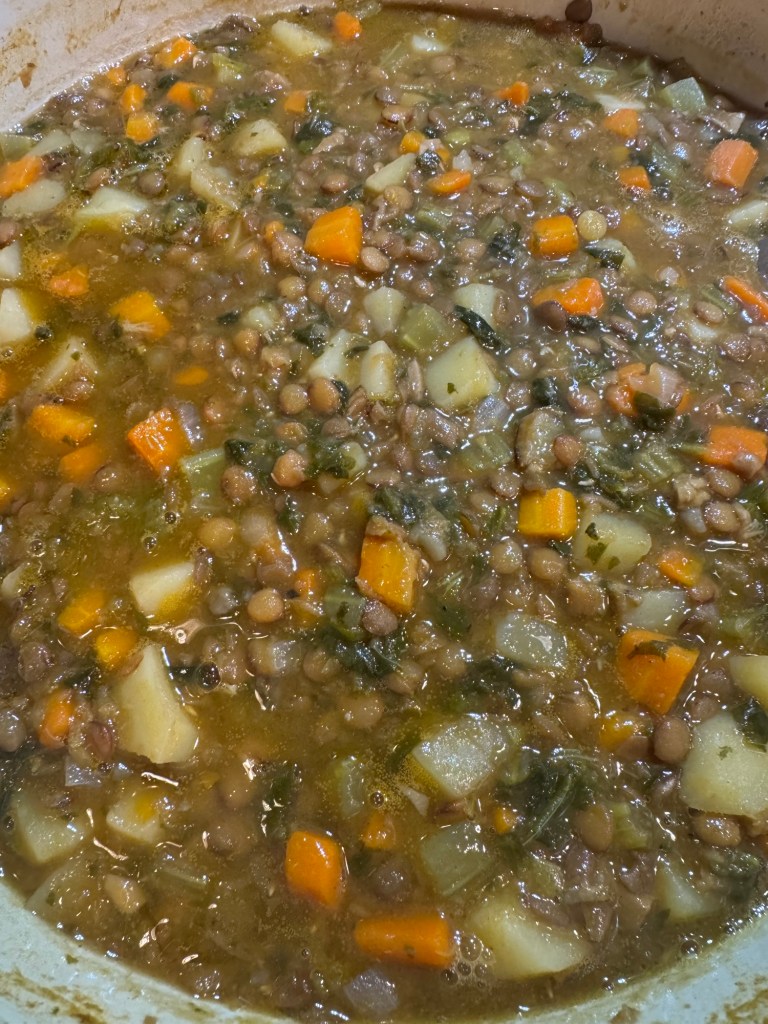 It is our annual custom to have lentil soup on New Year’s Day, a tradition believed to bring good luck and prosperity. Each year I switch up the recipe. This lentil soup is packed with yummy and nutritious vegetables and accented with fresh lemon juice. Delicious!
