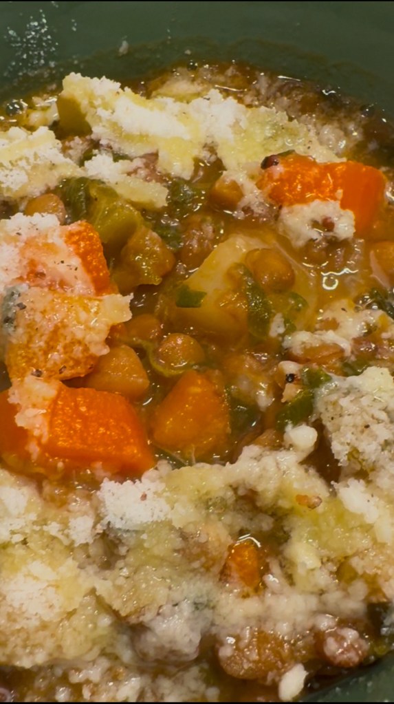 - Serving idea: Top each bowl with a sprinkling of Parmesan cheese, a drizzle of good extra virgin olive oil, and some fresh cracked black pepper. Serve soup with some fresh bread and butter. Yum!
