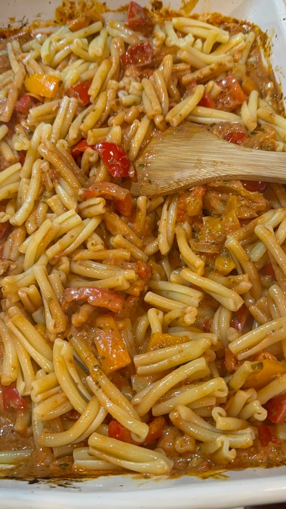 - While the sauce is roasting, cook the pasta al dente, according to package directions. Be sure to reserve 1/4 cup of the pasta water in case the sauce is too thick.