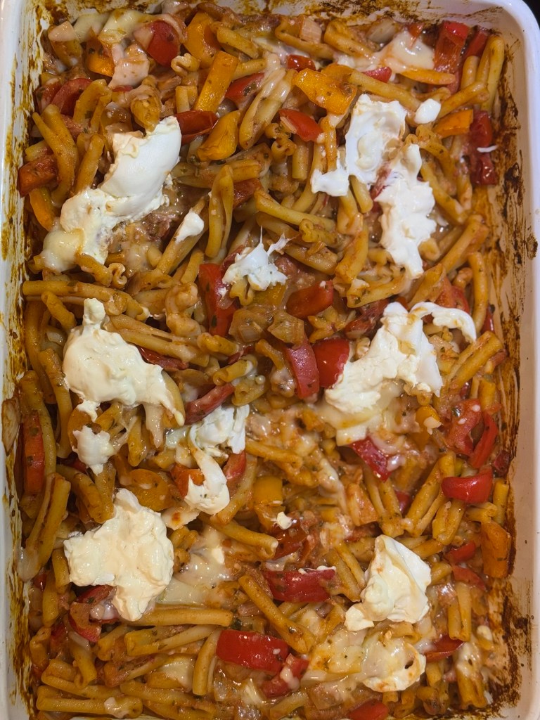 - Place the peppers, onions, garlic, pesto, cherry tomatoes, tomato paste, paprika, red pepper flakes, and a pinch of salt and pepper into a large baking dish. Mix it up. Put the goat cheese in the middle of the dish and cover the cheese with the sauce mixture.