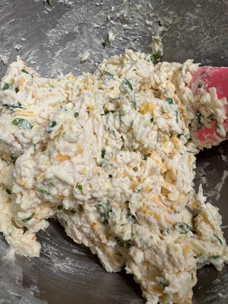- Fold in cheddar cheese and chives/parsley (if using). The dough will be thick and sticky.