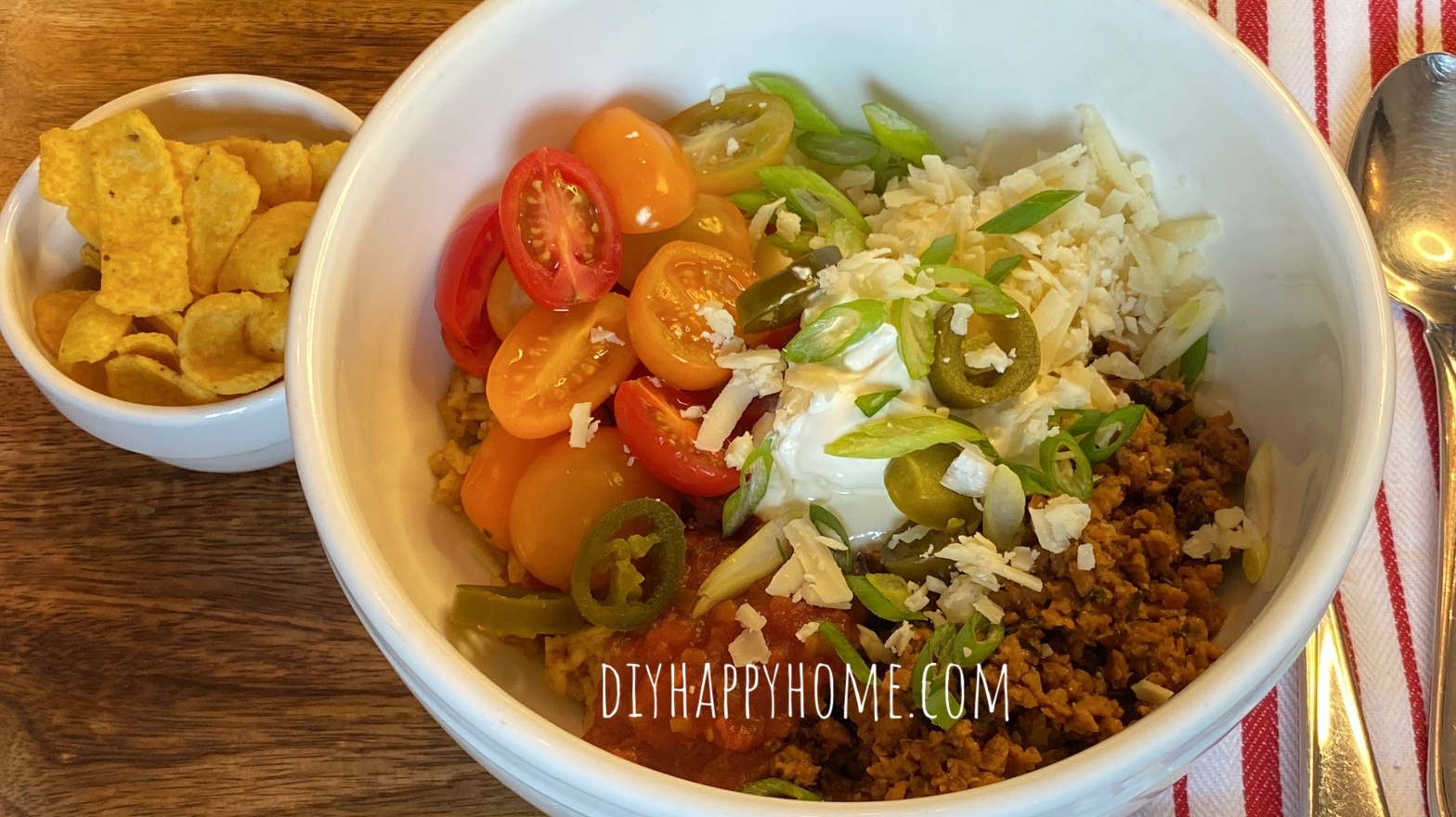 Lime, garlic, and bell pepper rice and chipotle black bean crumbles star in this filling vegetarian street taco bowl. Add your favorite taco toppings and you have a hearty and satisfying meal that took no time at all.